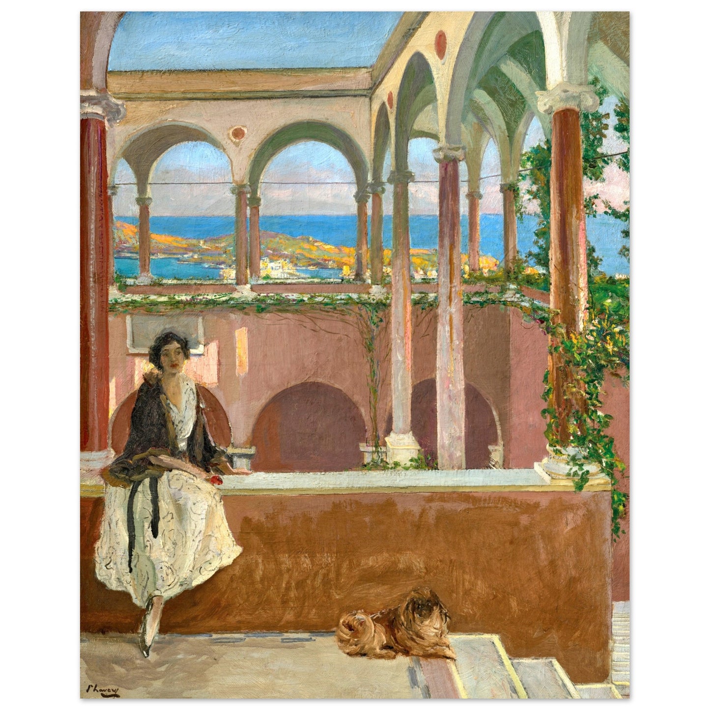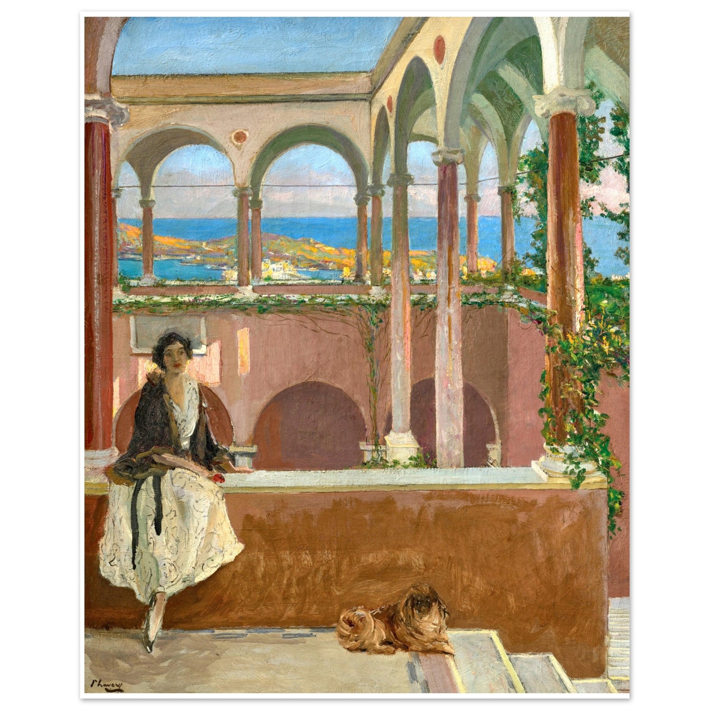 This painting is inspired by Lavery's stay at the Eden-Grand Hotel during the winter of 1921, where the lush villas and breathtaking sea views served as his muse. The work portrays a tranquil villa framed by Ionic columns, leading your gaze to the shimmering cobalt waters of the Mediterranean. An elegant woman, seated in harmony with her luxurious surroundings, lends a timeless grace to the scene. Lavery's painterly style reflects the spontaneity of the moment, bringing a fleeting, dream-like quality to the work.
