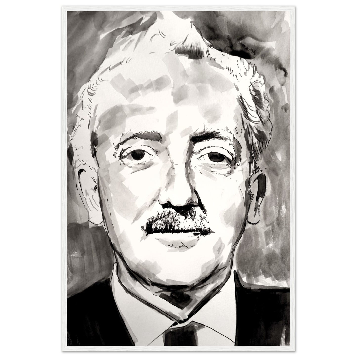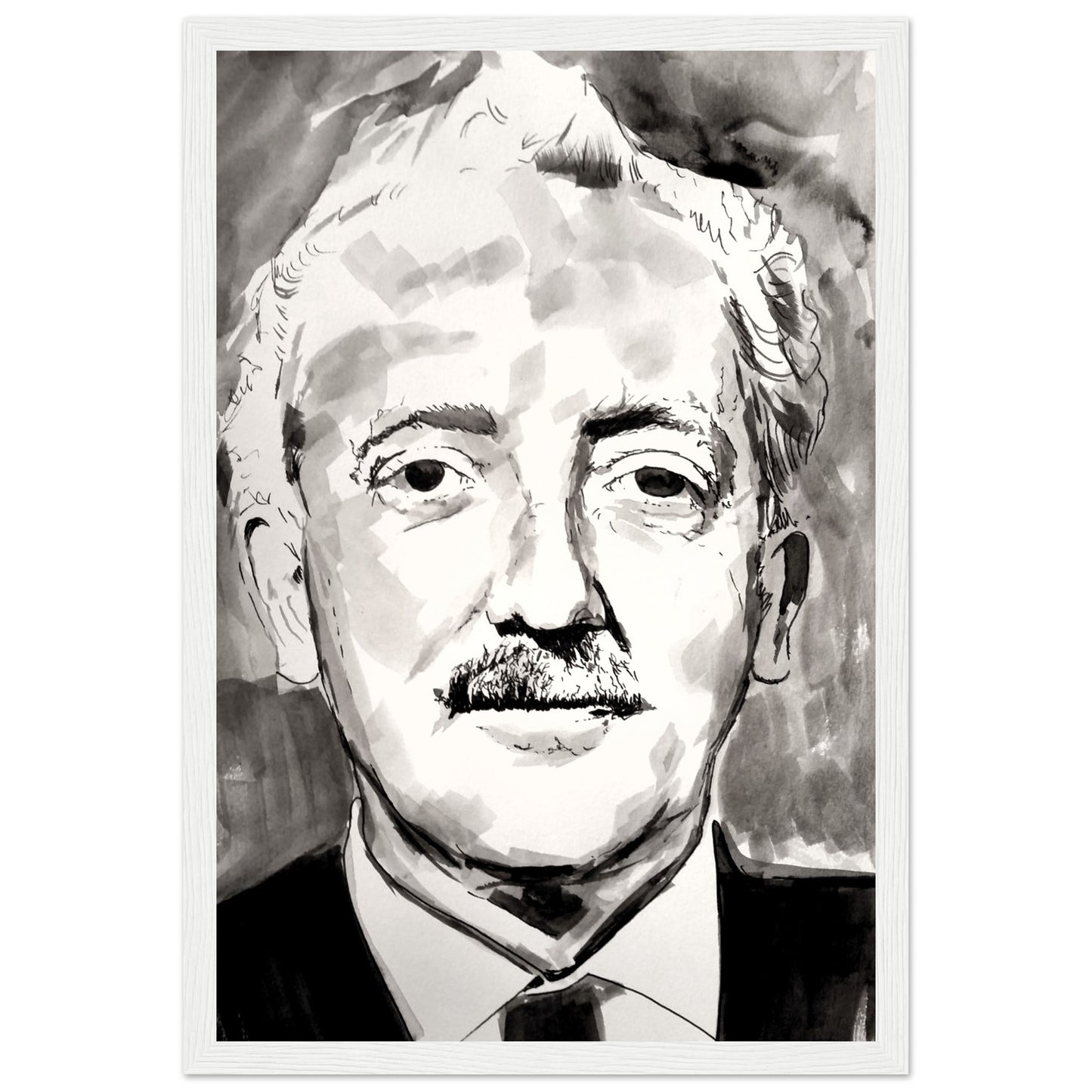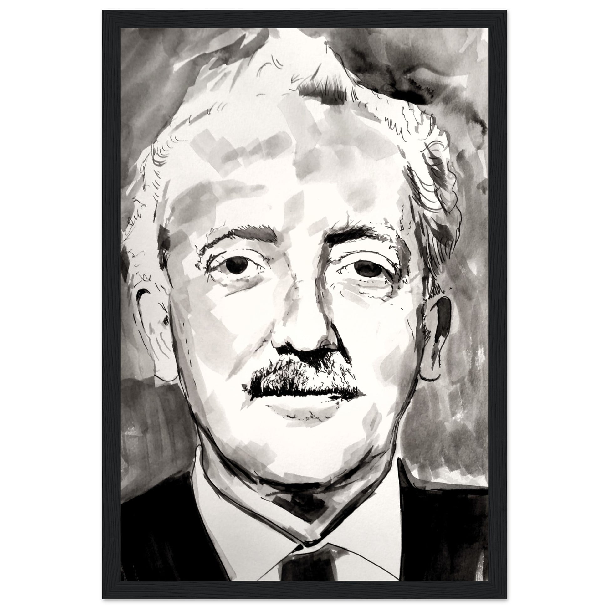 Seán Ó Riada fine art framed print. Celebrate the renowned Irish composer's musical heritage, adding cultural richness to your space. A cherished piece for Irish Traditional Music fans, honouring the legacy of Sean Ó Riada in this black & white timeless style. Original Artwork created by Irish Artist Ó Maolain.