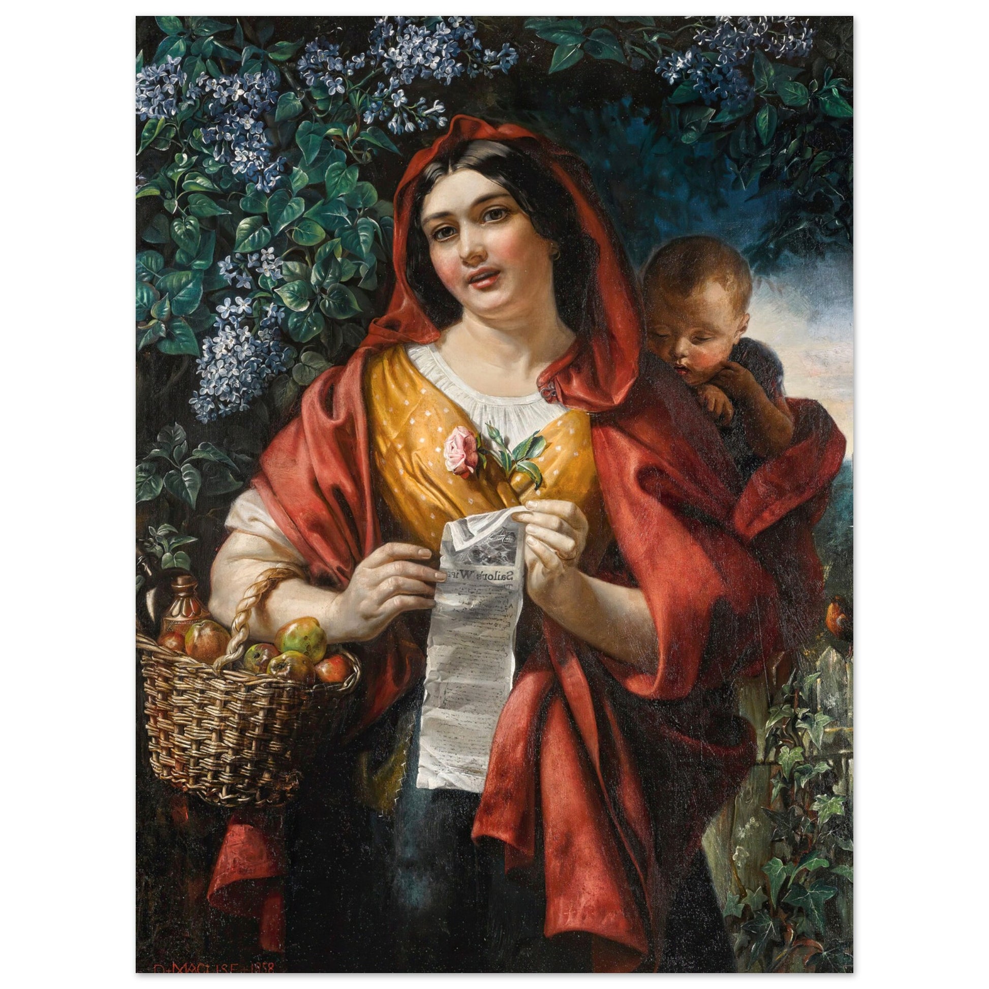 Bring the charm of Victorian artistry into your home with this stunning reproduction of The Ballad Seller (1858), painted by renowned Irish artist Daniel Maclise. Maclise, celebrated for his historical and literary subjects, masterfully captures the beauty of a young ballad seller in a lush countryside setting.