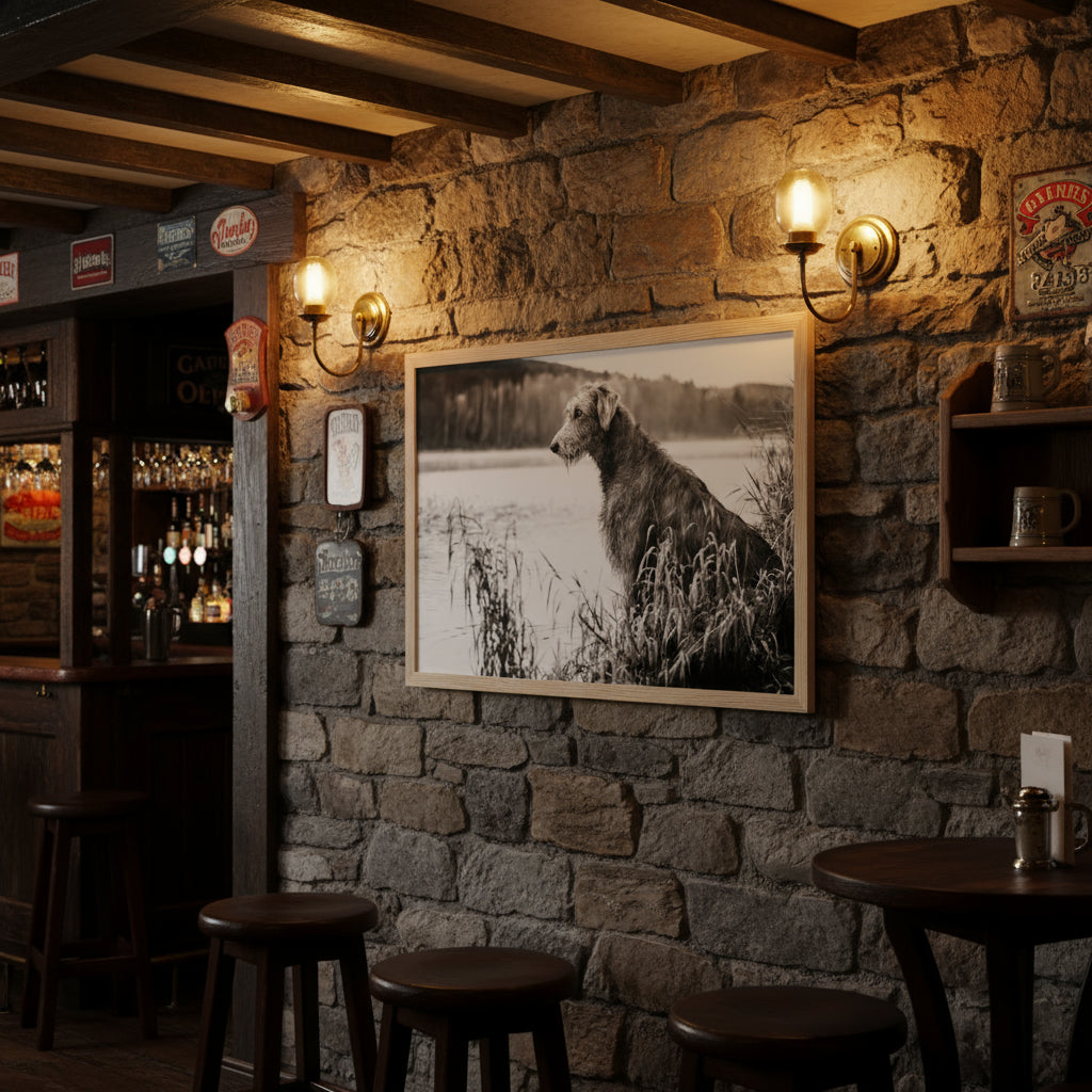 Celebrate the noble spirit of Ireland’s most iconic dog with this elegant black and white framed print of the Irish Wolfhound. Captured with striking detail, this portrait reflects the breed’s quiet strength, loyalty and historic connection to Irish myth, poetry and aristocracy.