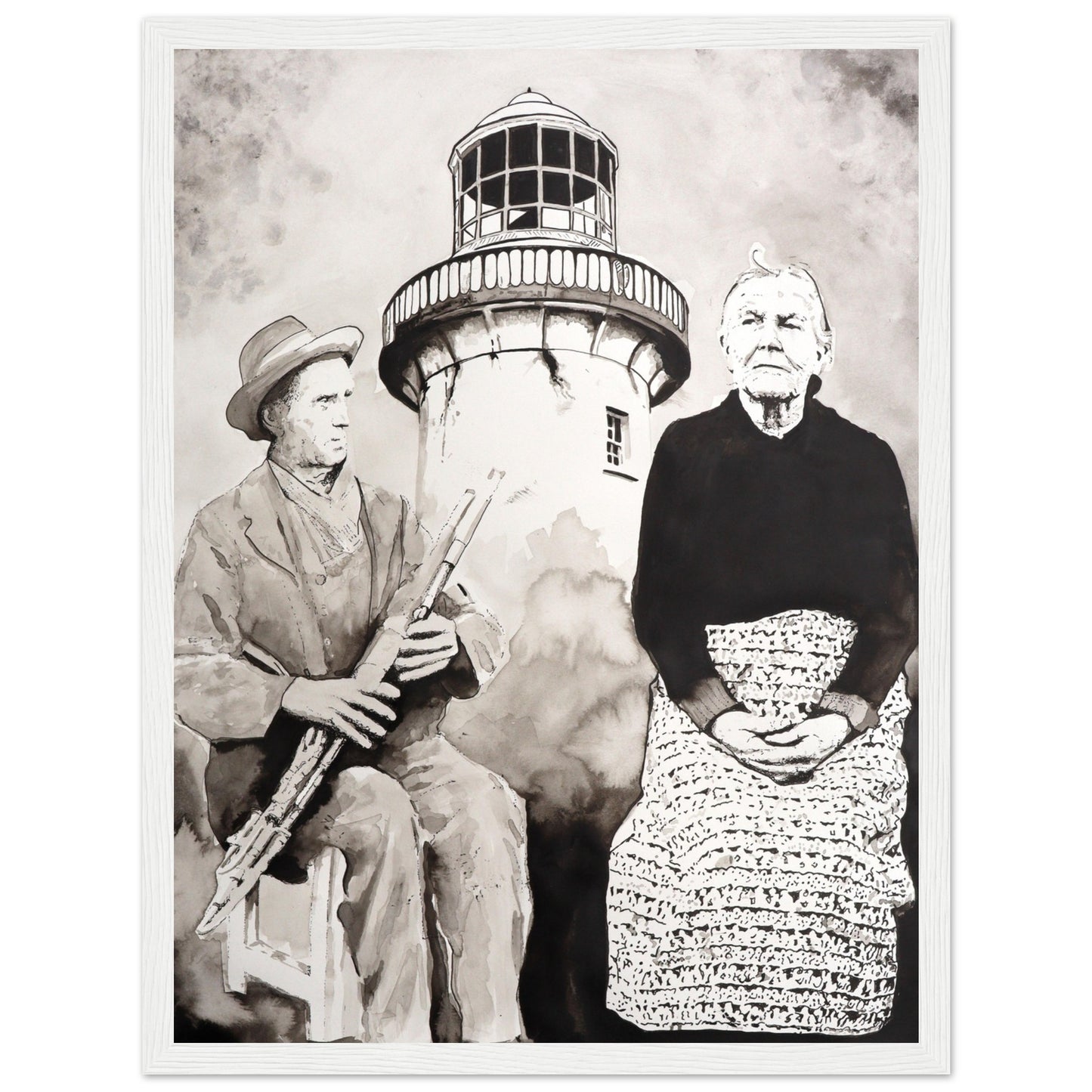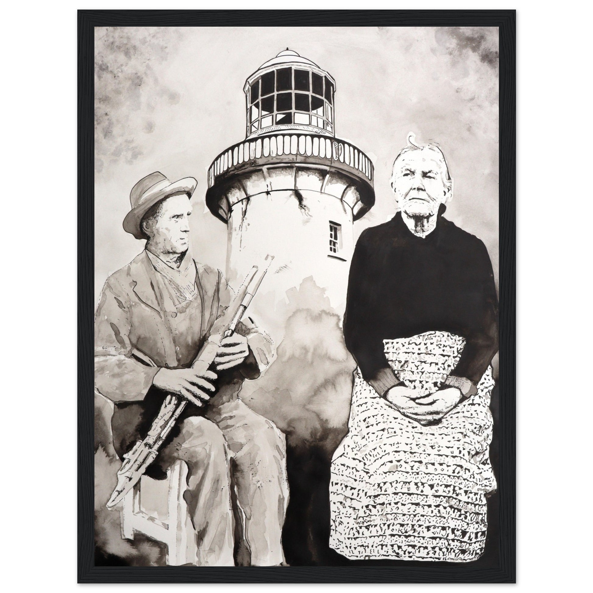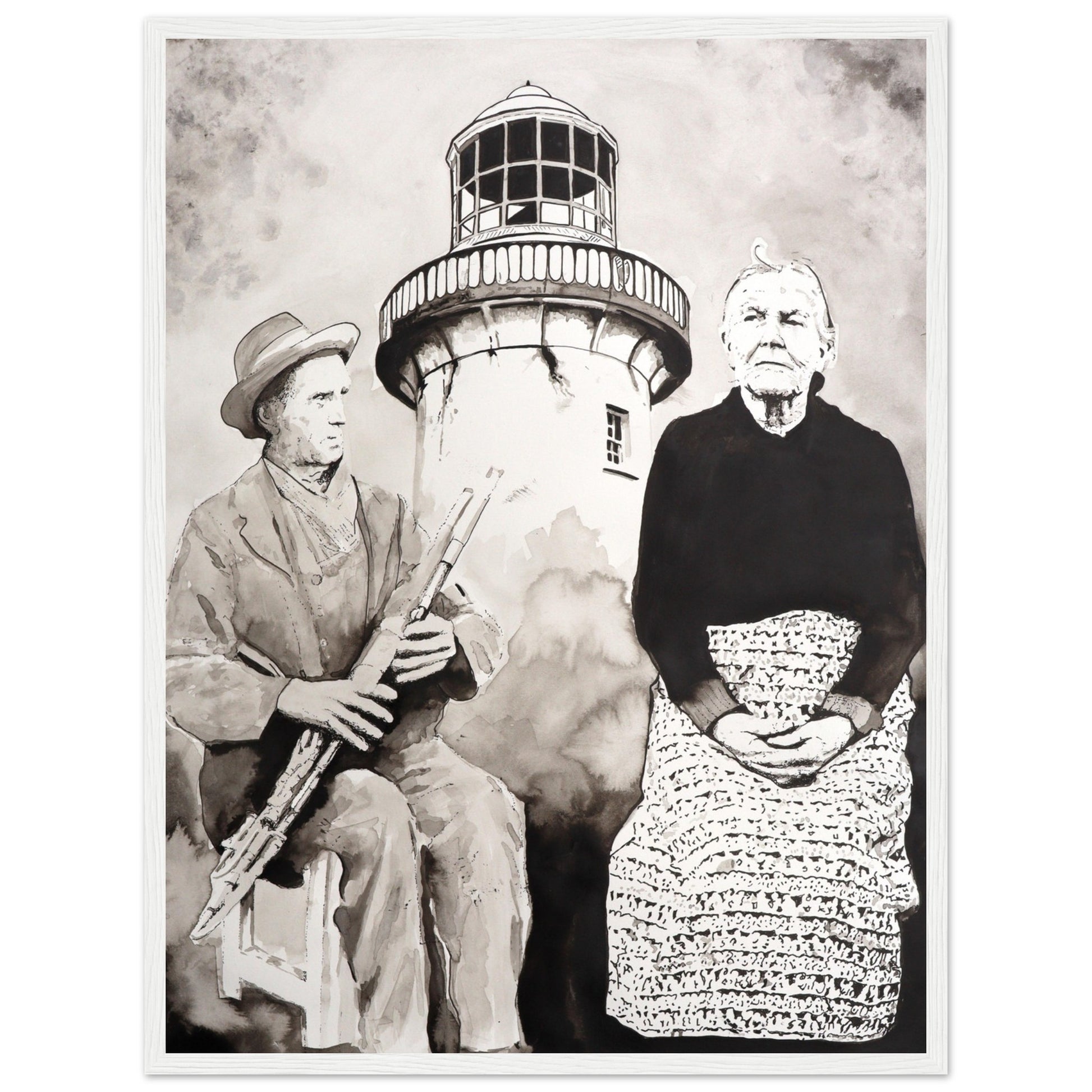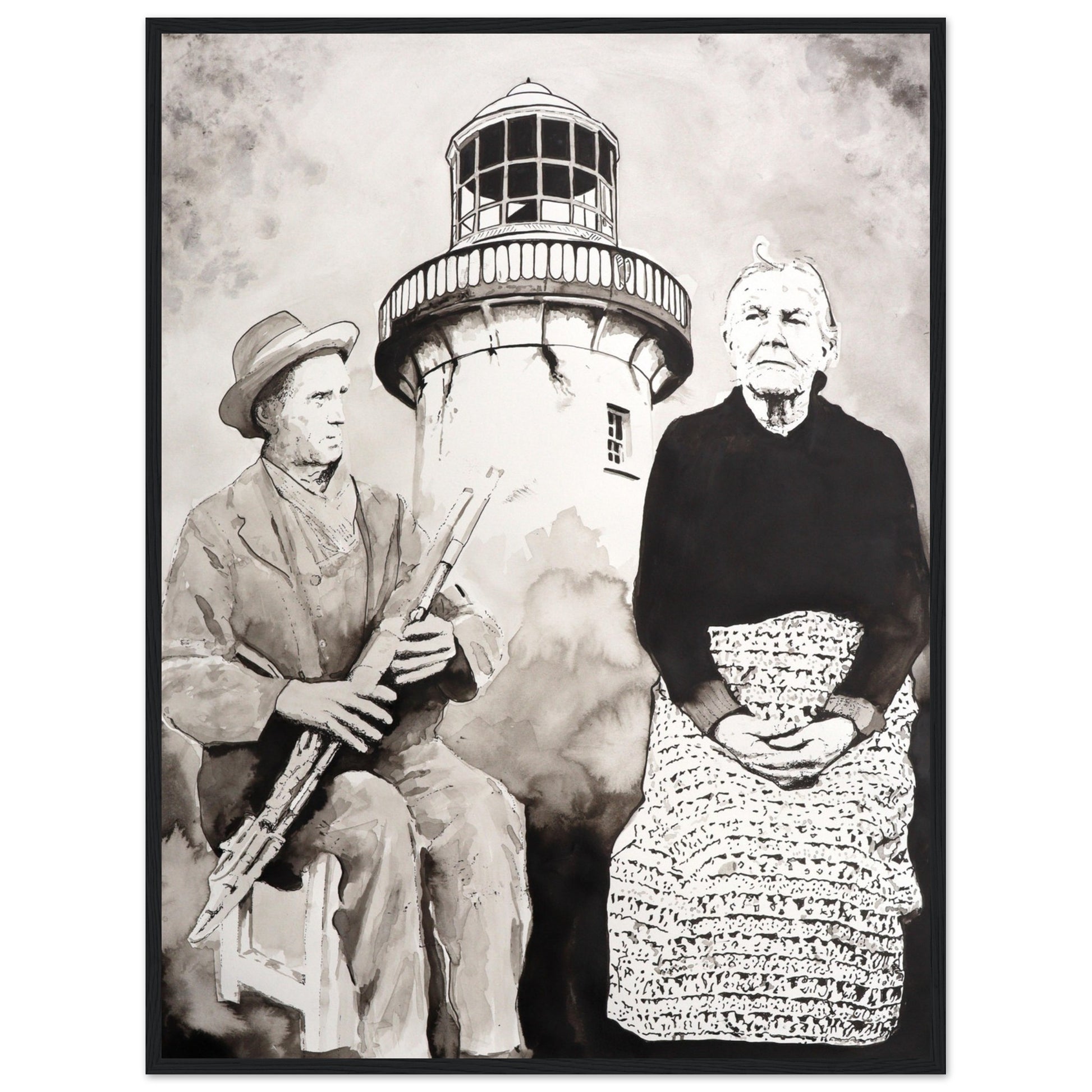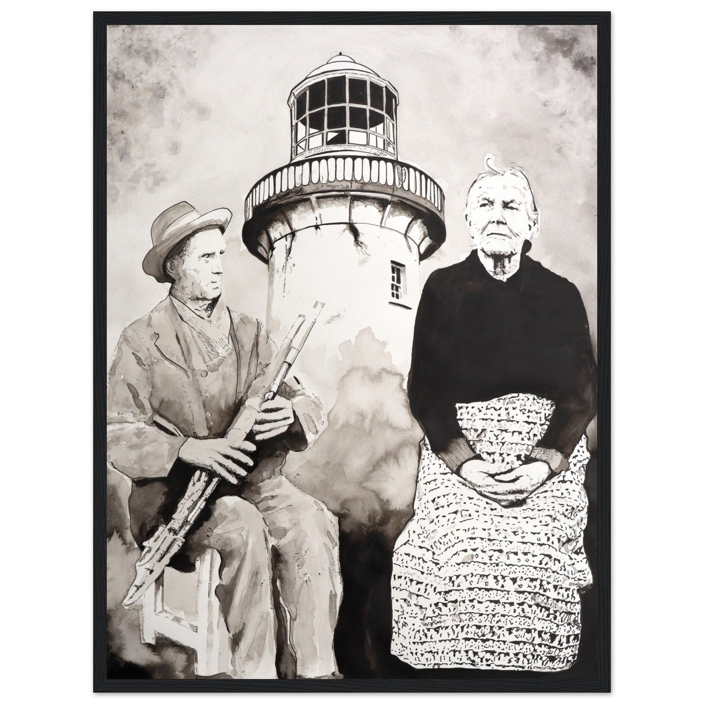 Róise Rua & Uilleann piper Aranmore Lighthouse Island Framed Wall Art Print by Irish Artist