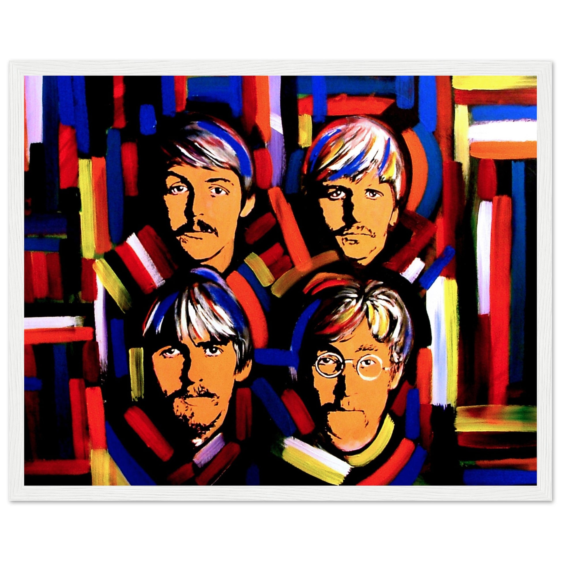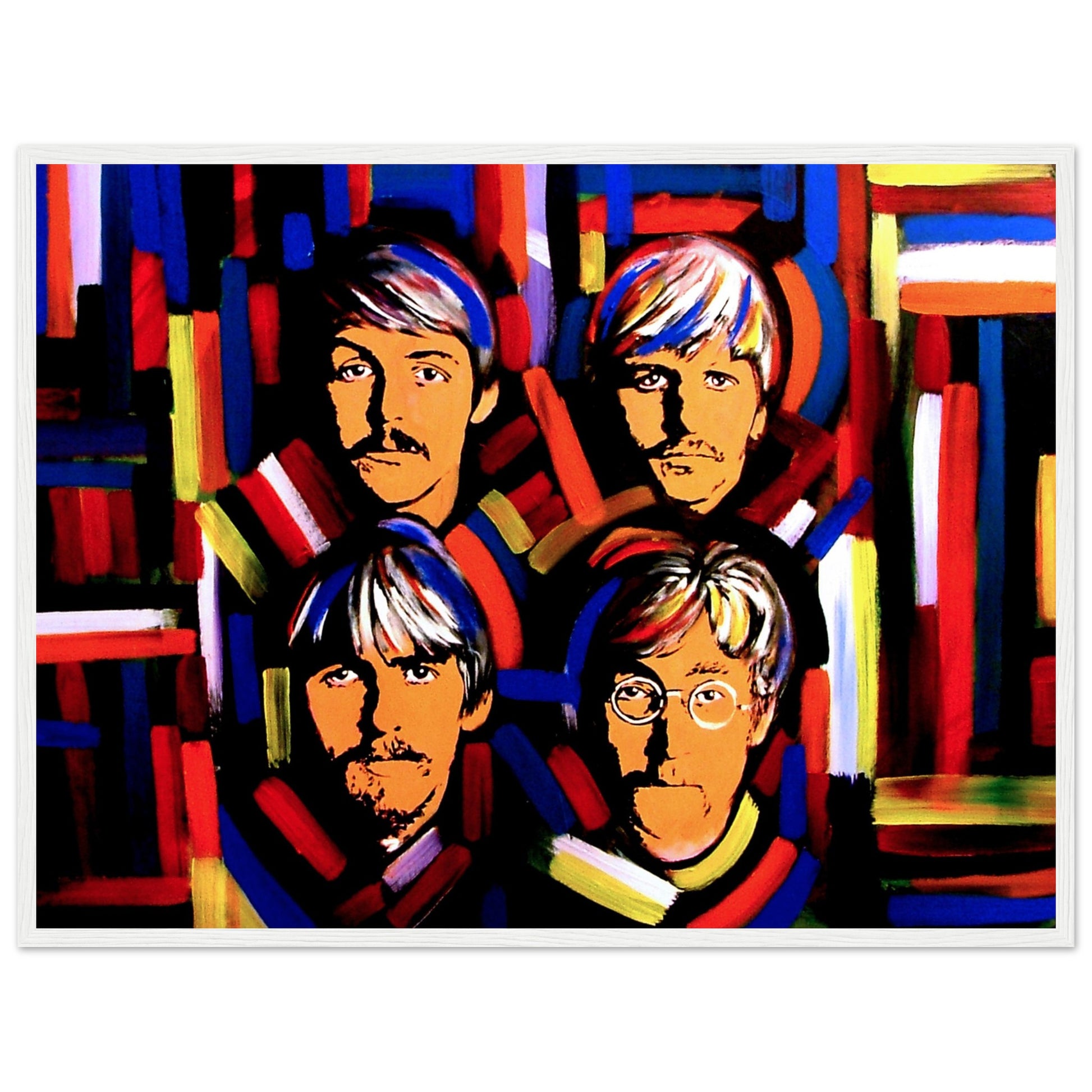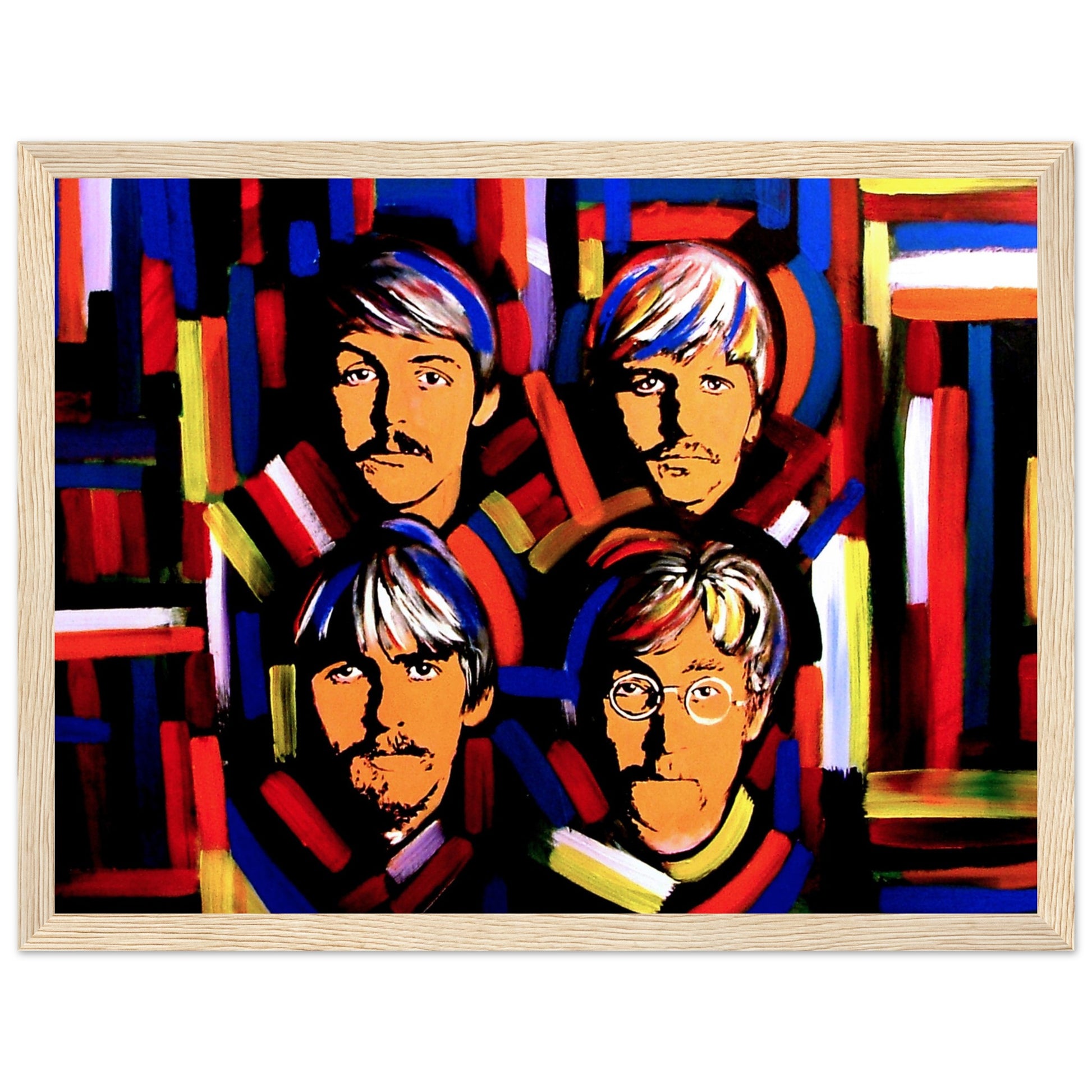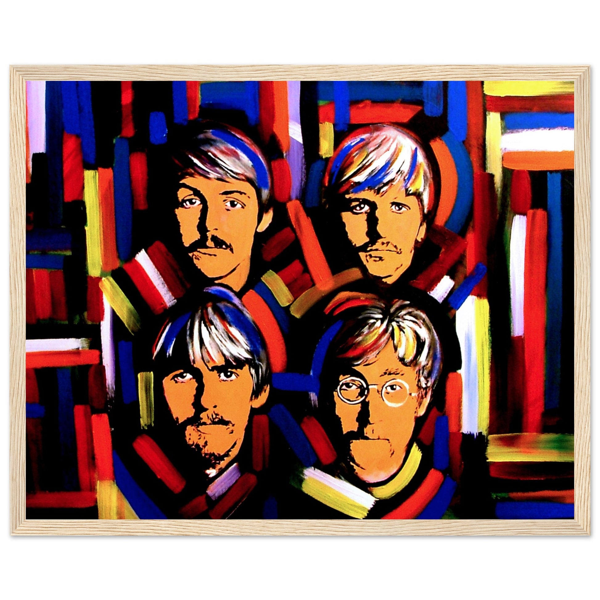 This vibrant art print by Irish artist Ó Maoláin showcases colorful portraits of the Fab Four: John Lennon, Paul McCartney, George Harrison, and Ringo Starr. It's a dynamic homage to Beatlemania, perfect for Beatles fans, capturing their legendary music and enduring cultural impact with artistic flair.
