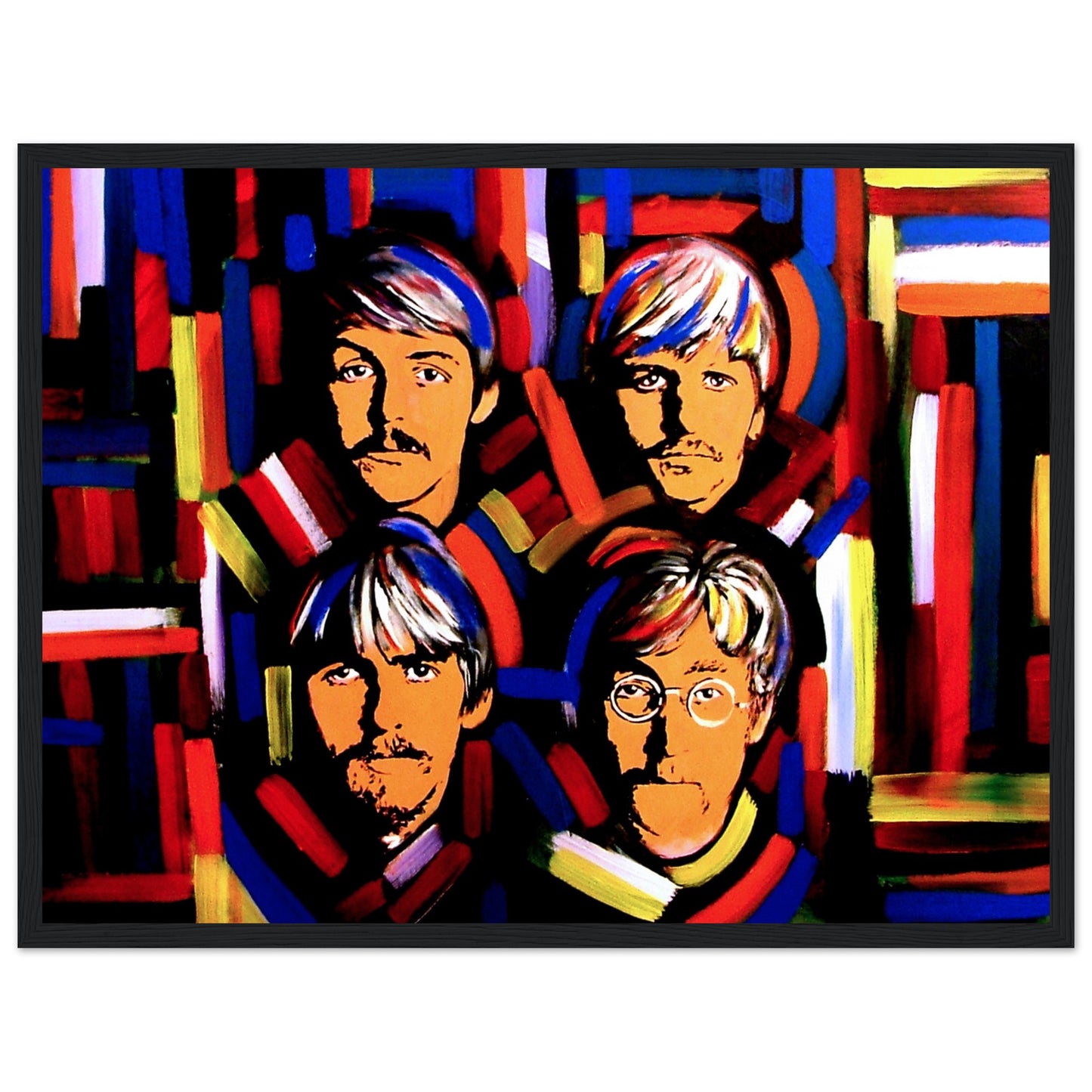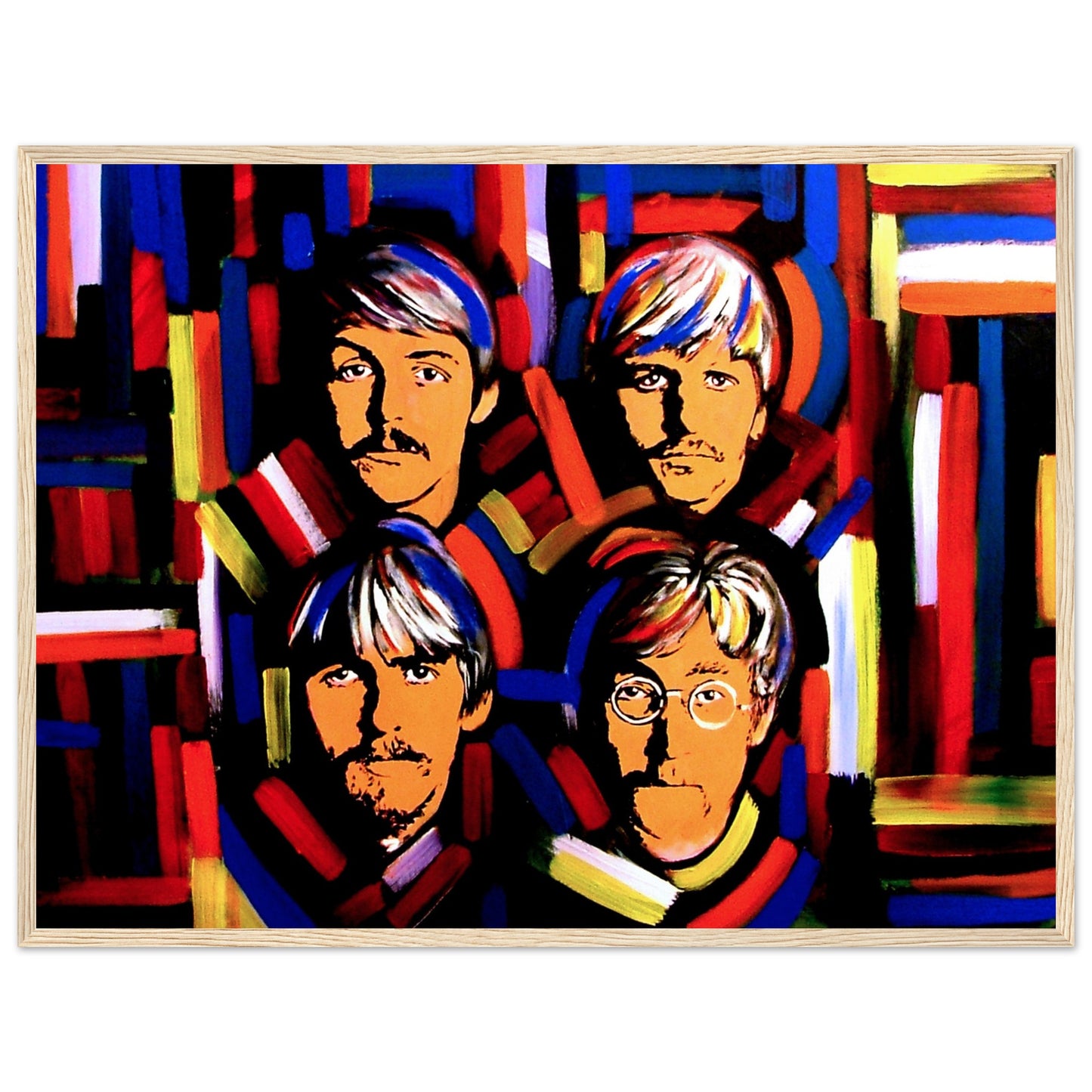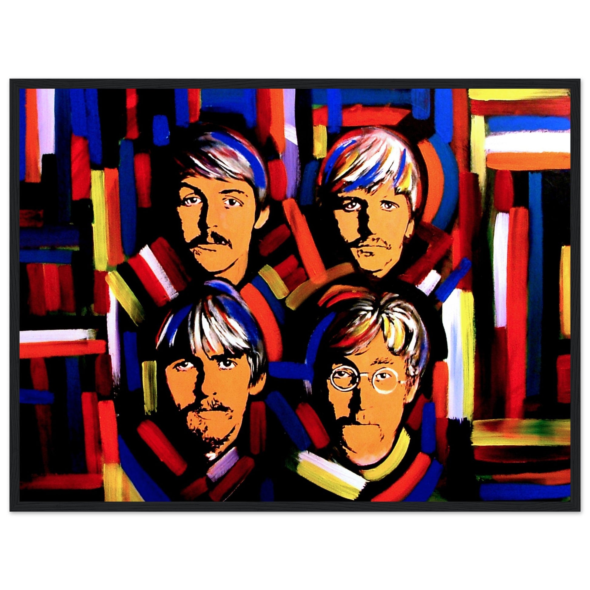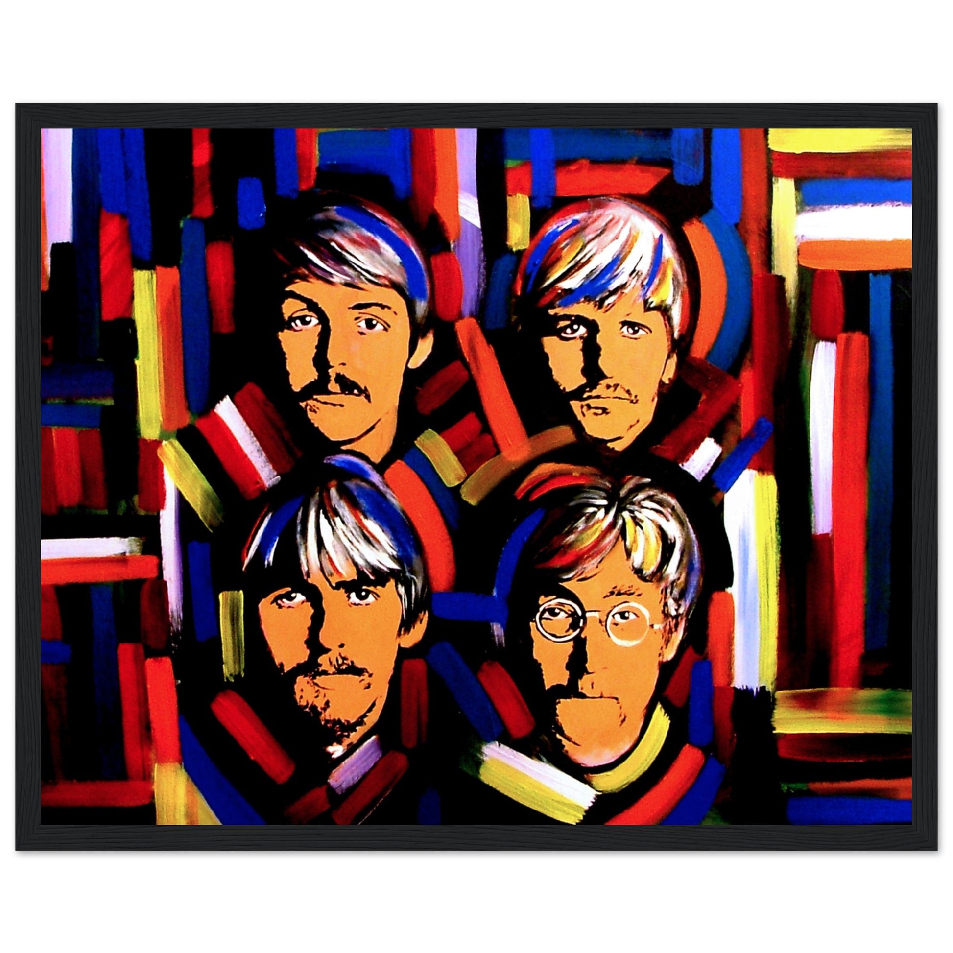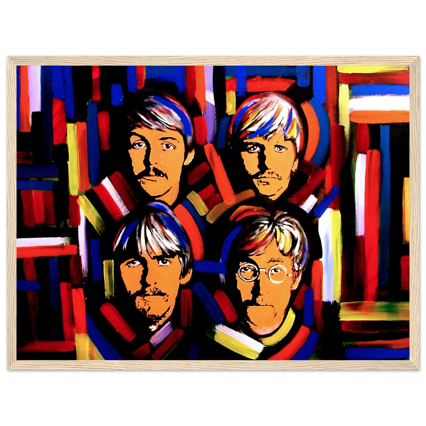 This vibrant art print by Irish artist Ó Maoláin showcases colorful portraits of the Fab Four: John Lennon, Paul McCartney, George Harrison, and Ringo Starr. It's a dynamic homage to Beatlemania, perfect for Beatles fans, capturing their legendary music and enduring cultural impact with artistic flair.