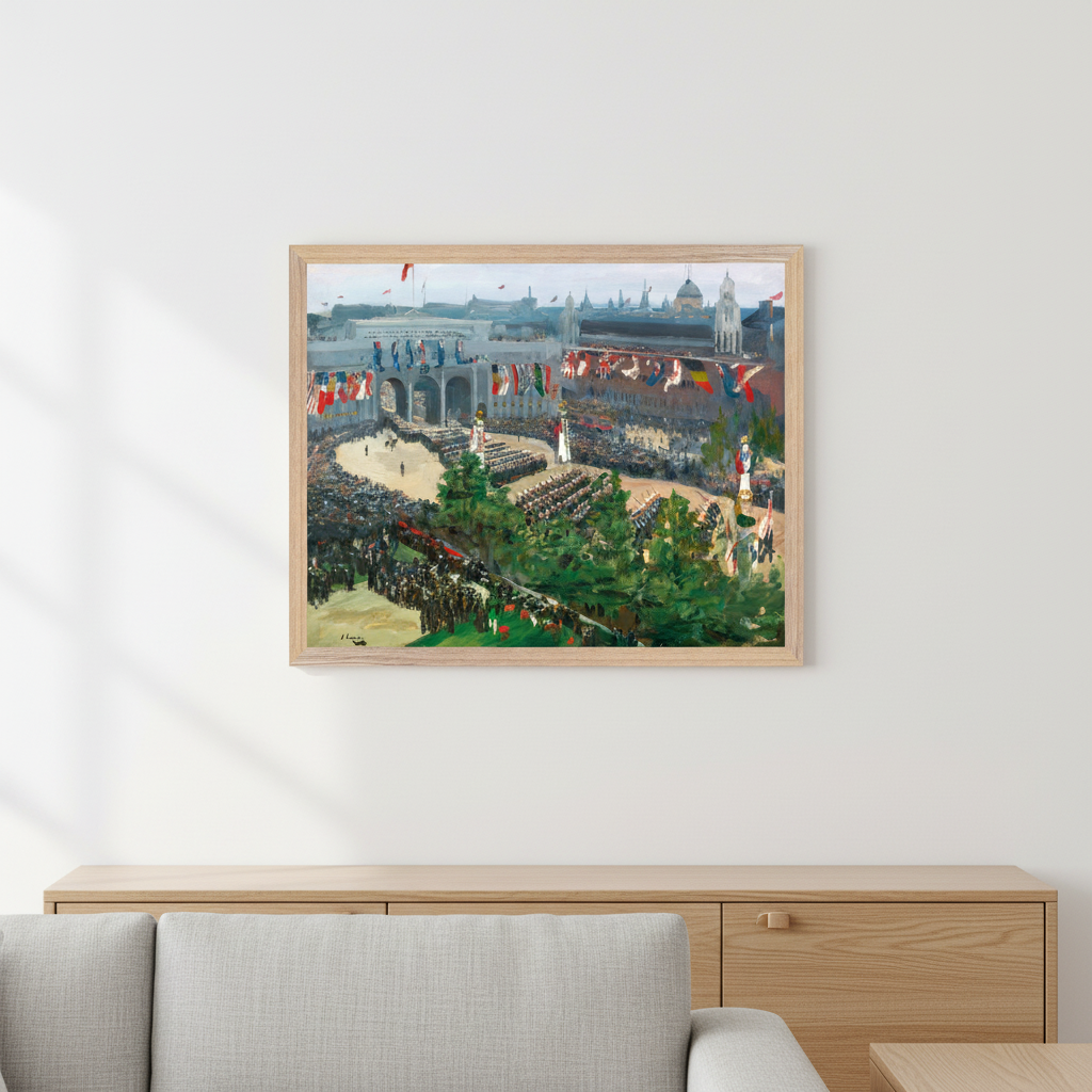 Peinte depuis le point de vue de Lavery, sur la terrasse de Carlton House, cette œuvre offre une perspective unique du cortège mené par des figures militaires emblématiques comme le maréchal Haig et le maréchal Foch. Les couleurs vibrantes, la composition dynamique et le souci du détail subliment l'ambiance festive et festive du défilé. Cette œuvre témoigne de la fin d'un conflit éprouvant, rend hommage à ceux qui ont servi et commémore un jour historique mémorable.