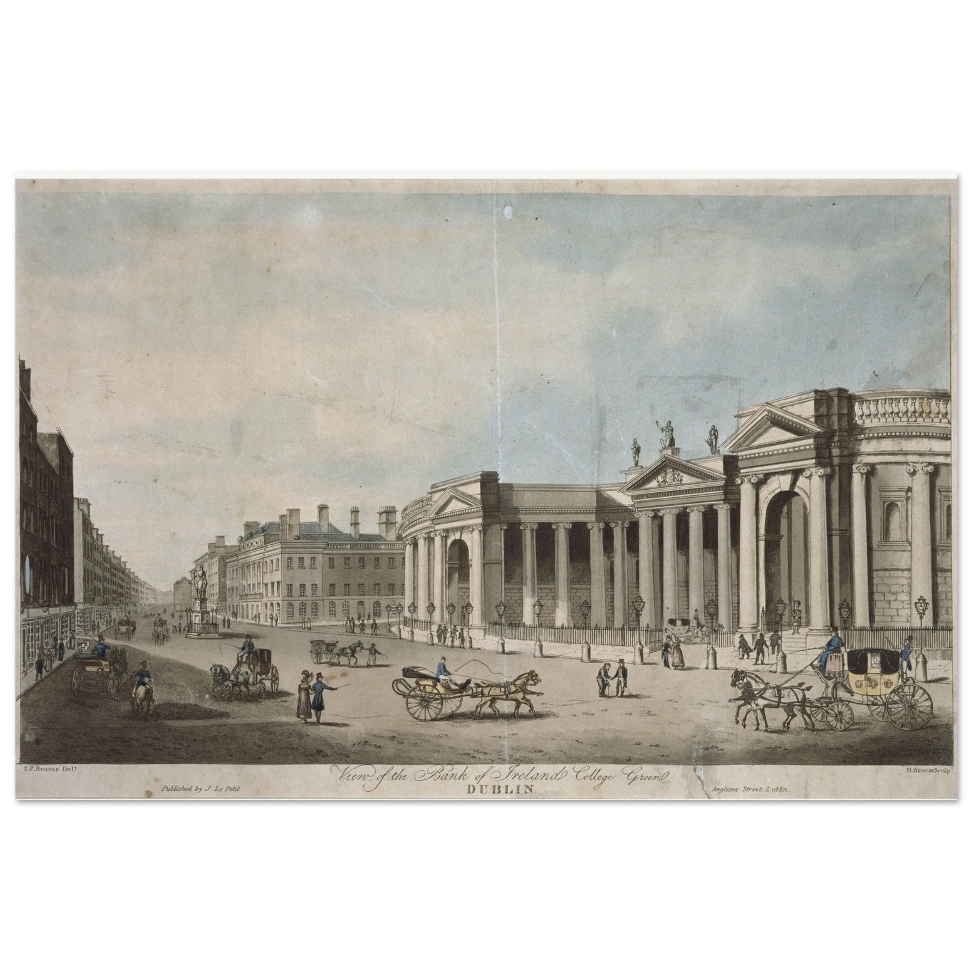 Step back in time with this stunning museum-quality reproduction print of the Bank of Ireland, College Green, Dublin, a masterpiece of 19th-century Irish art. Originally drawn by Samuel Frederick Brocas (c. 1792–1847) and engraved by Henry Brocas the Younger (c. 1798–1873), this artwork beautifully captures the grandeur of one of Dublin’s most iconic buildings.