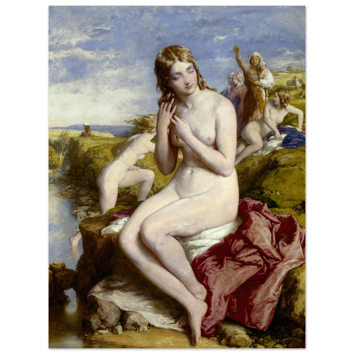 Surprised by a seemingly unexpected male visitor, the female bathers—except for the oblivious young woman in the foreground—scatter in a moment of shock and modesty. This dynamic composition showcases Mulready’s exceptional skill in capturing movement, human emotion, and the natural beauty of the setting. His masterful study of the human form from multiple angles highlights his talent, which was highly admired, even by Queen Victoria herself.