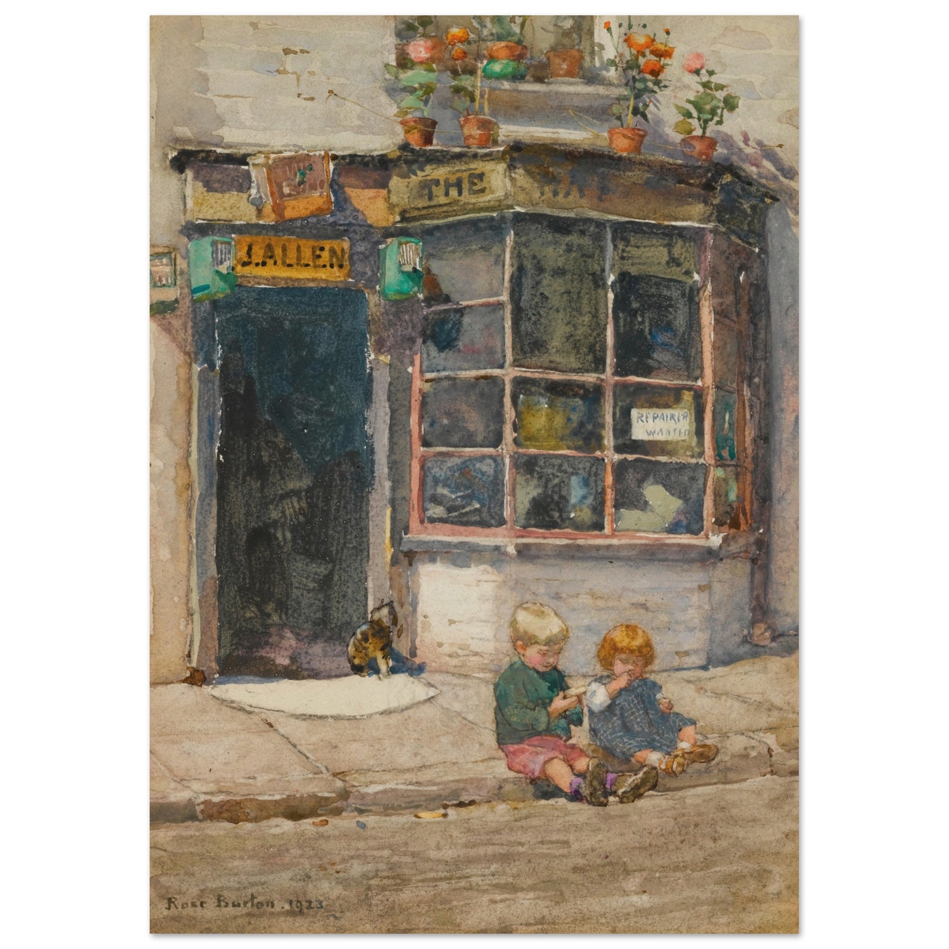 Bathed in the warmth of a bright summer’s day, this delightful painting captures the quiet beauty of everyday life. Two children sit on the sidewalk, sharing a simple yet intimate moment, while the quaint cobbler’s shop—adorned with blooming flowers—stands as a testament to Barton’s masterful attention to detail. Her expressive brushwork brings texture to the weathered storefront, the sunlit street, and the delicate reflections in the window, evoking a sense of nostalgia and serenity.
