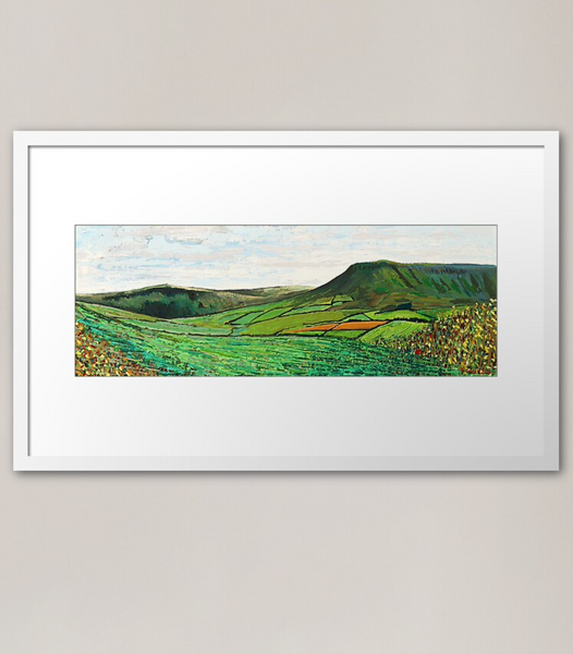 Titled "The Green Glens of Antrim" canvas wall art print. This canvas print depicts Lurig Mountain with Glenariff in distance, County Antrim, North Coast Causeway Coast and Glens, Northern Ireland, this print was created by Irish artist Ó Maoláin.