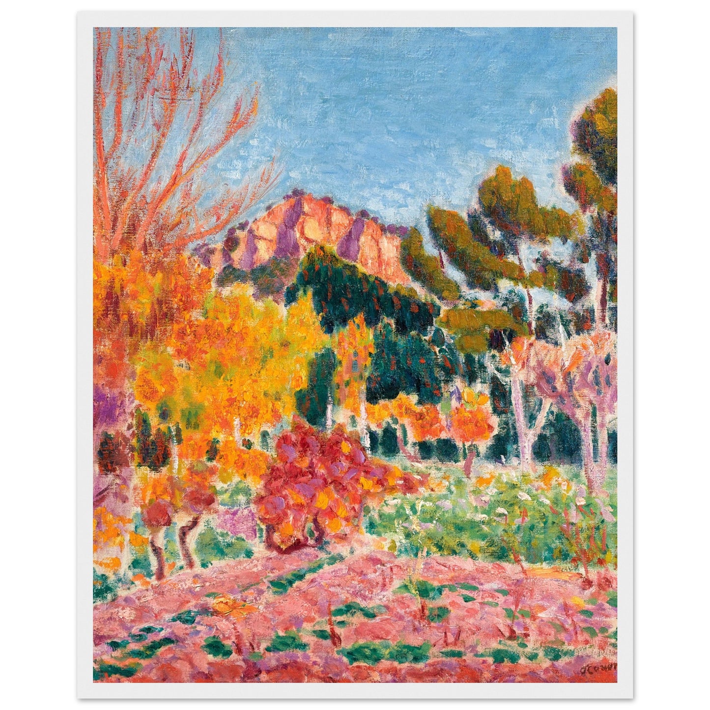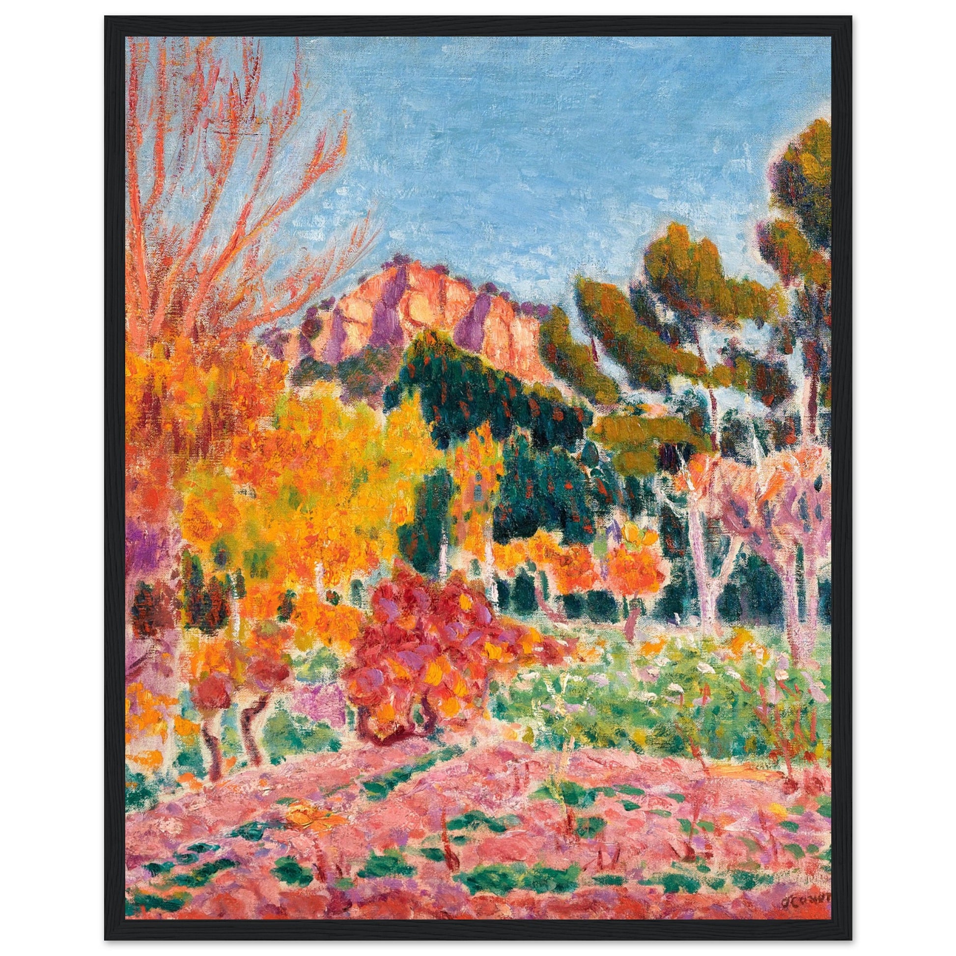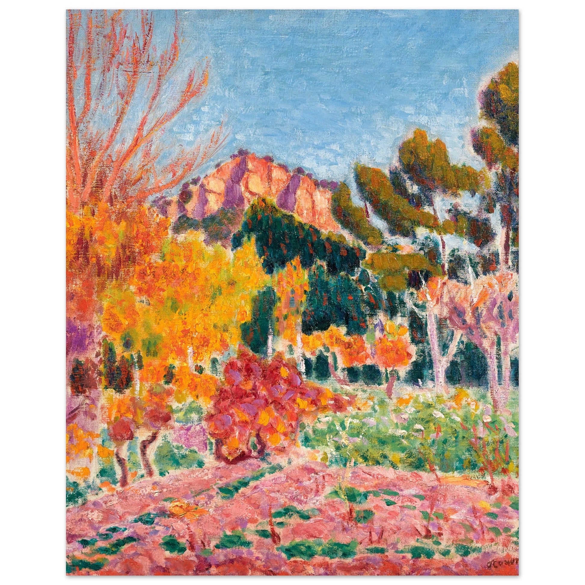 Elevate your space with a piece of Irish artistic history! Our reproduction art print of "Landscape, Cassis" (1913) by the celebrated Irish master Roderic O'Conor brings a burst of colour and energy to any room. This vibrant landscape, featuring bold brushstrokes and rich Mediterranean hues, perfectly captures O'Conor's signature Post-Impressionist style, making it a standout addition to your art collection.