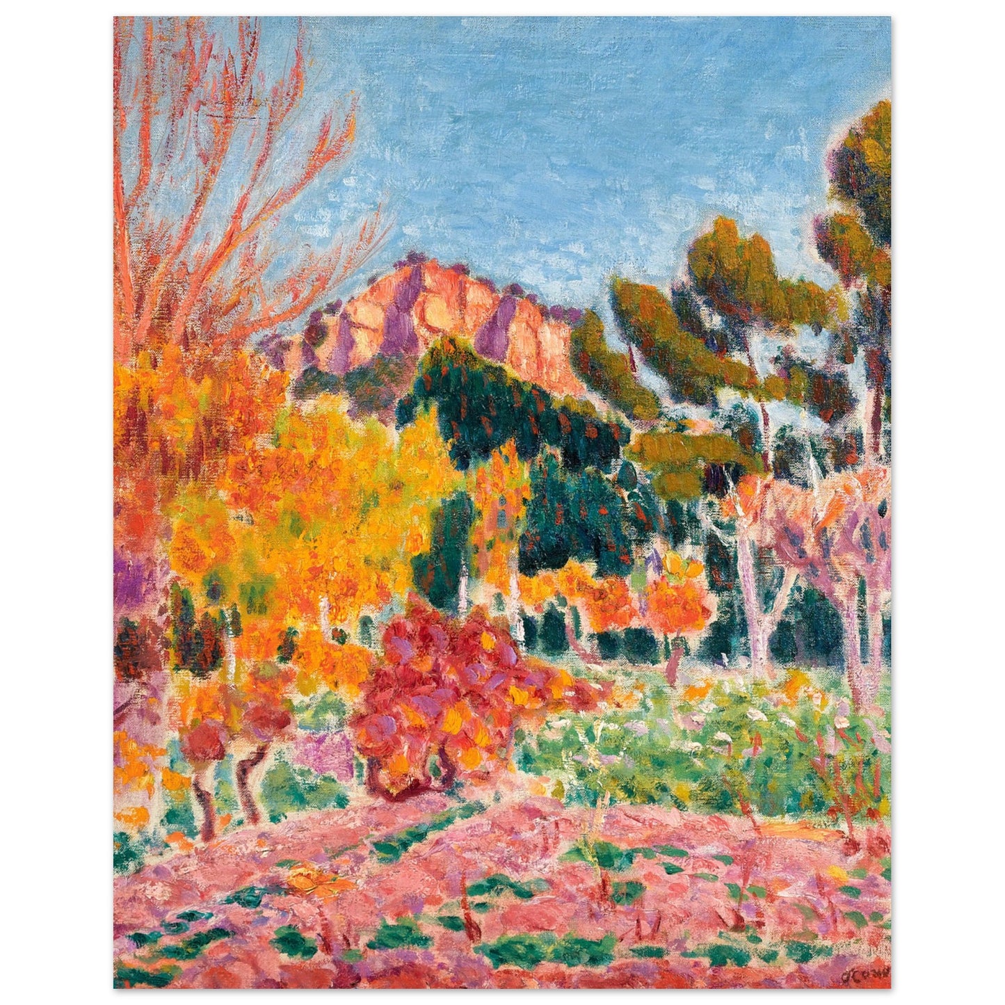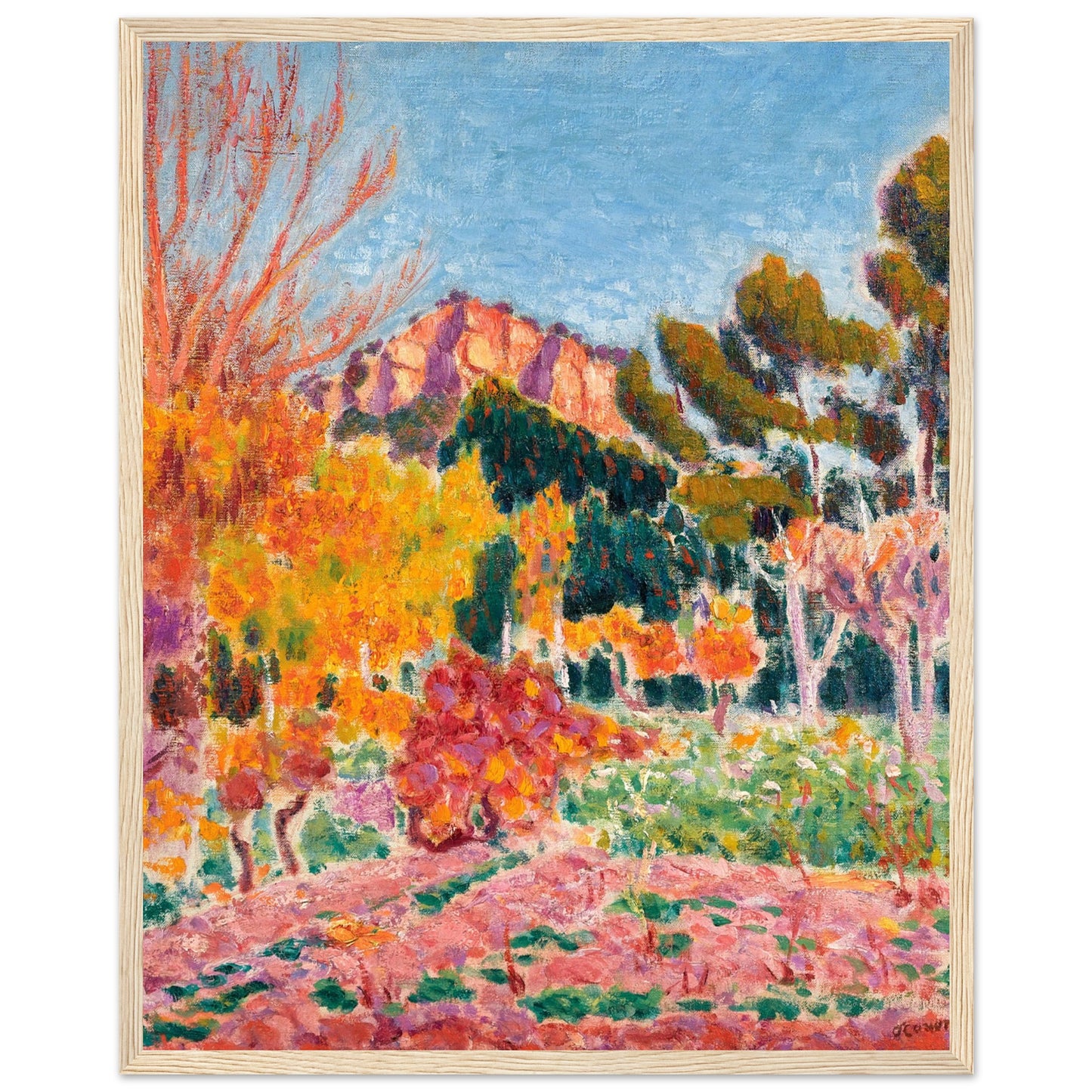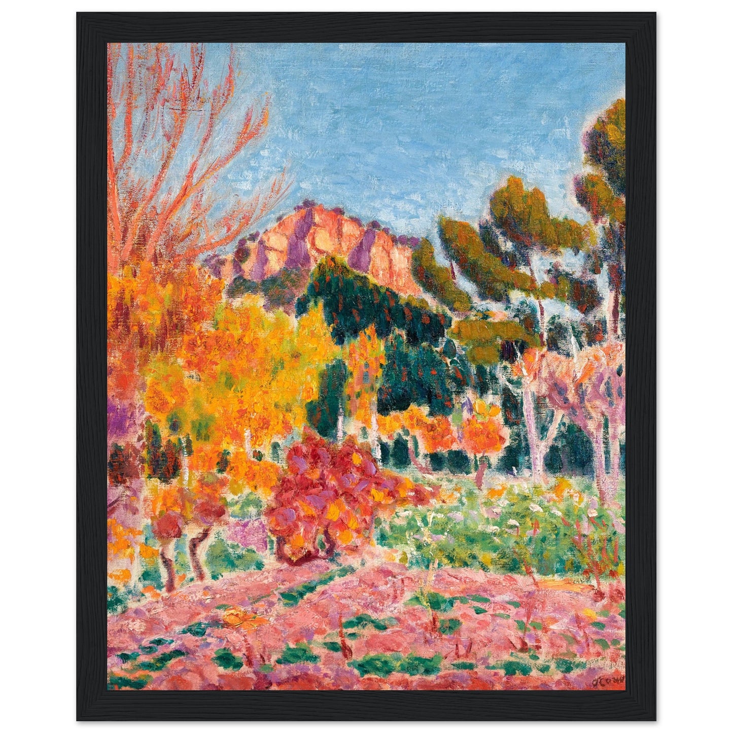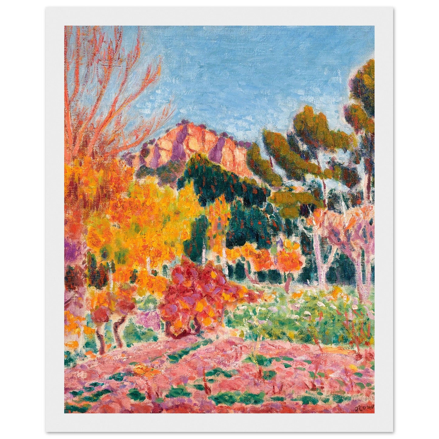 Elevate your space with a piece of Irish artistic history! Our reproduction art print of "Landscape, Cassis" (1913) by the celebrated Irish master Roderic O'Conor brings a burst of colour and energy to any room. This vibrant landscape, featuring bold brushstrokes and rich Mediterranean hues, perfectly captures O'Conor's signature Post-Impressionist style, making it a standout addition to your art collection.