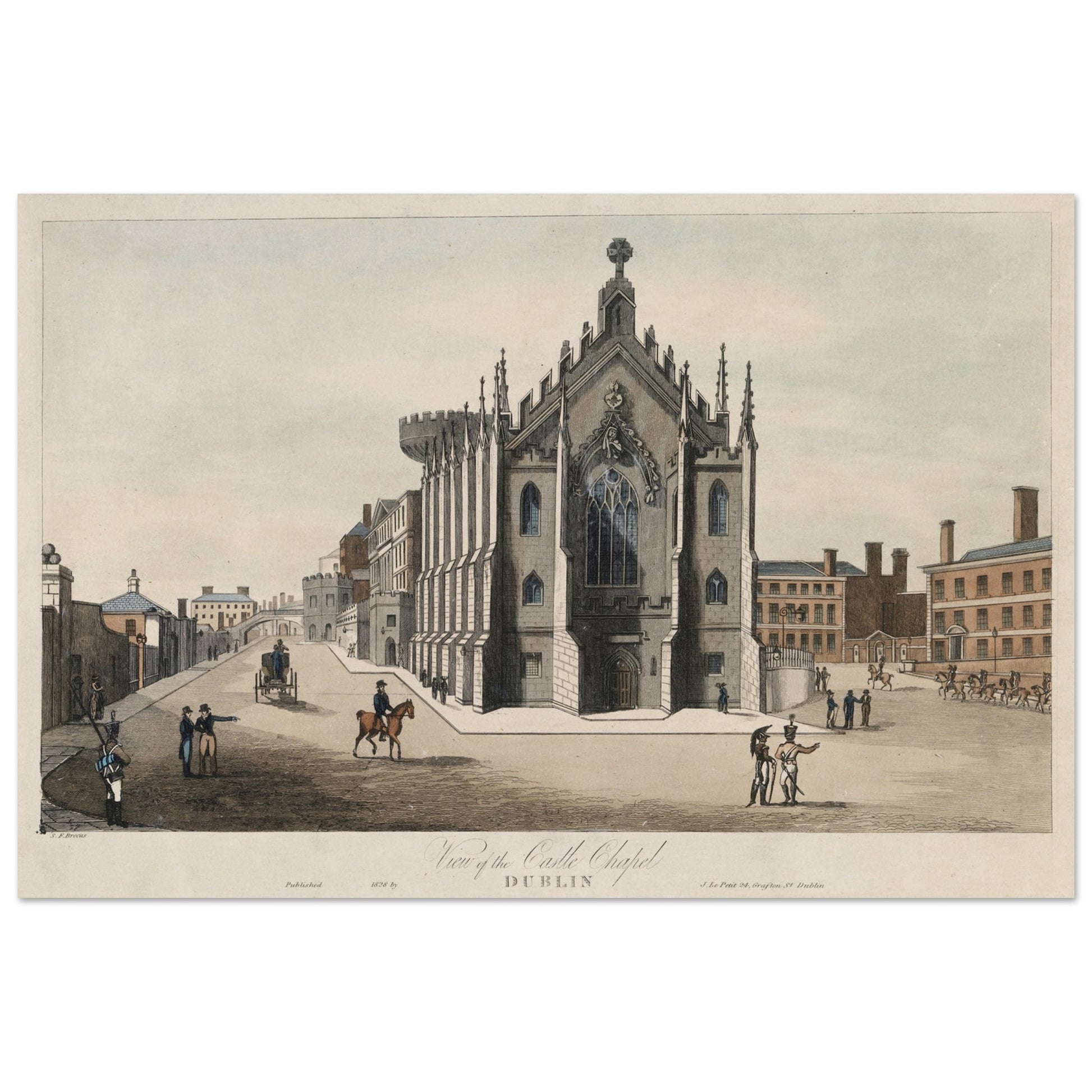 This exquisite artwork captures the stunning Gothic Revival architecture of The Chapel Royal, one of Dublin’s most celebrated landmarks, nestled within the historic Dublin Castle. First completed in 1814, the chapel was a masterpiece of intricate stonework and elegant design, beautifully depicted in this early 19th-century print.