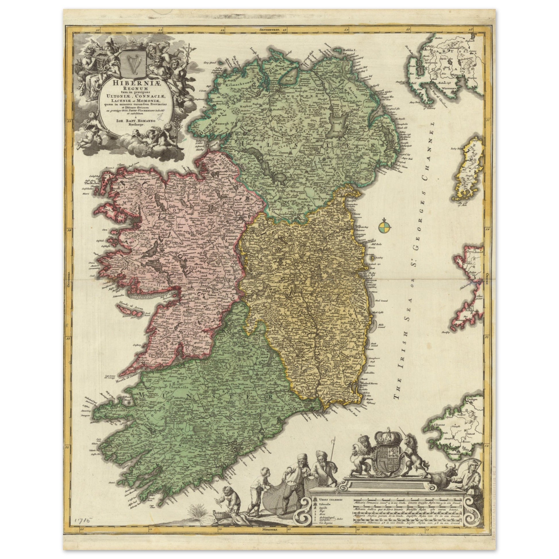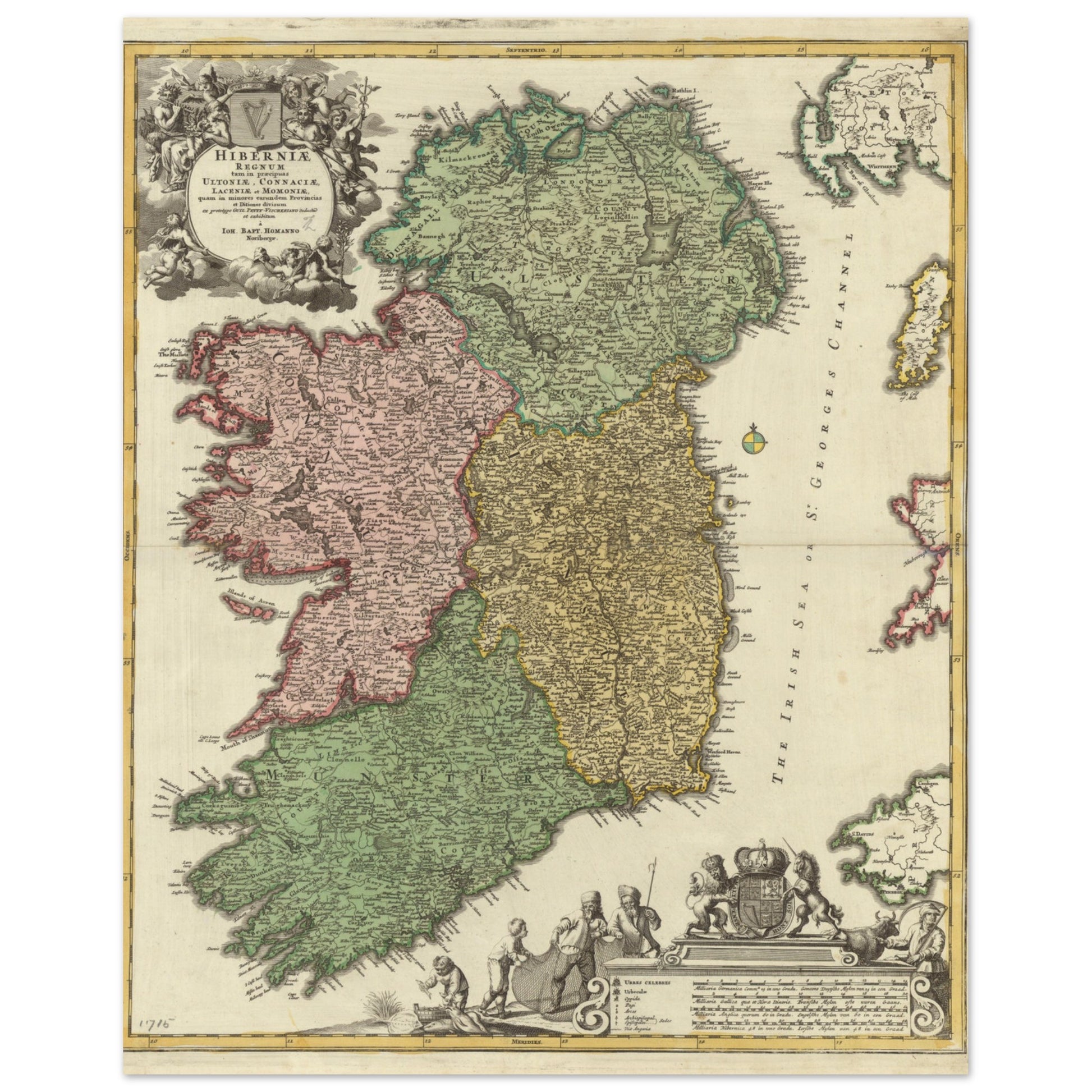Immerse yourself in the rich history and stunning geography of Ireland with our hand-colored reproduction of "The Kingdom of Ireland, Divided as Much into the Main Regions of Ulster, Connacht, Leinster and Munster." This magnificent map, originally published in 1715 by renowned engraver Johann Baptist Homann, is a testament to the artistry and cartographic precision of its time.