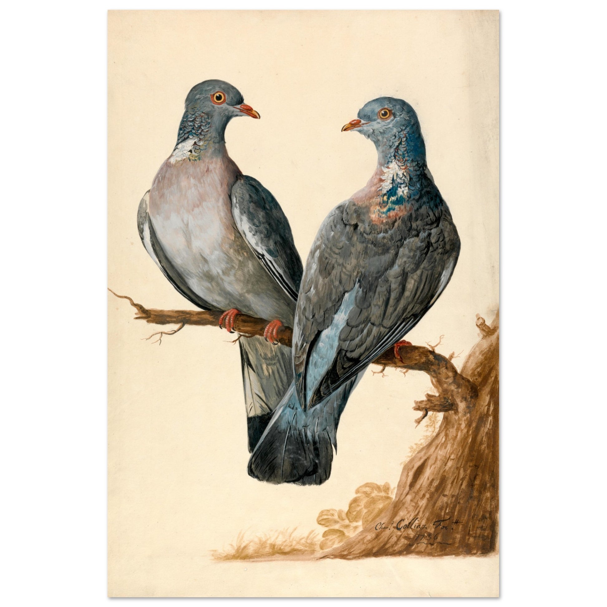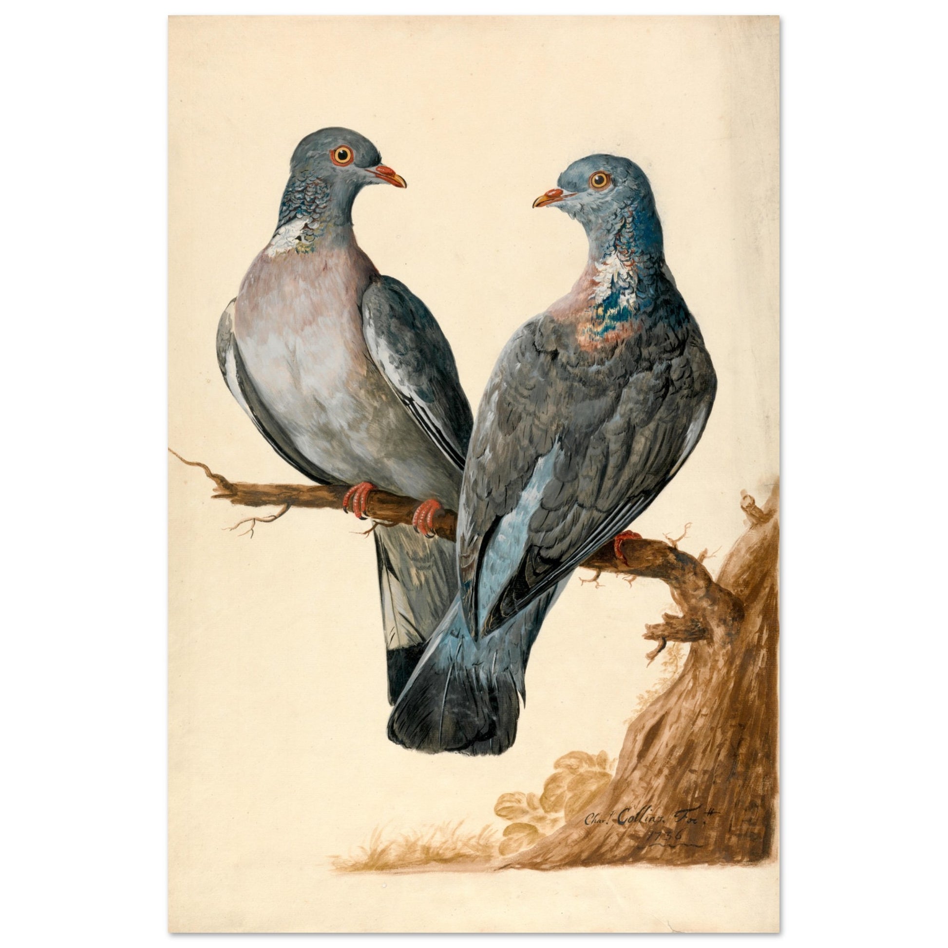 Transport yourself to the elegance of the 18th century with this stunning reproduction of Two Wood Pigeons by renowned Irish artist Charles Collins (1680–1744). This exquisite drawing captures a pair of Common Wood Pigeons with remarkable detail, inspired by specimens from the era. Collins’ mastery of animal portraiture is on full display, showcasing his ability to breathe life into his subjects.